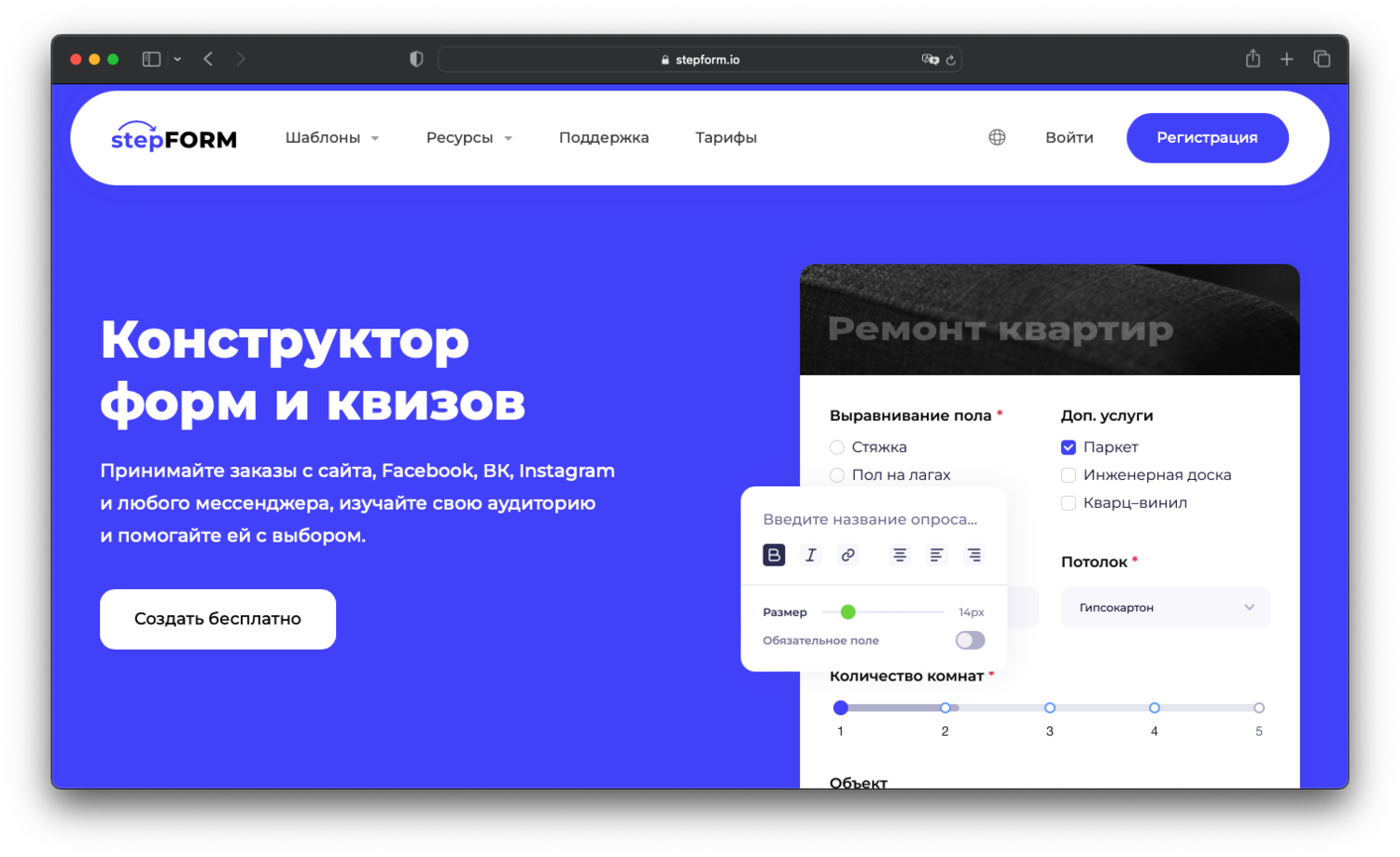 stepFORM представляет собой российский онлайн-сервис, который позволяет владельцам сайтов и предпринимателям создавать красивые формы и опросники. Это вполне универсальный инструмент — с его помощью можно добавить на сайт опросы, квизы, анкету и другие компоненты. Также с его помощью можно публиковать формы не только на сайте, но и в социальных сетях и даже в SMS сообщениях. Особенностью онлайн-сервиса является то, что его использование не требует навыков программирования.